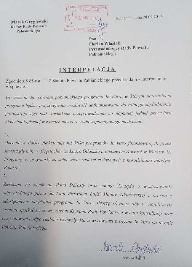 Podczas czwartkowej sesji Rady Powiatu Pabianickiego, radny SLD Marek Gryglewski wystąpił z interpelacją w sprawie utworzenia powiatowego programu in vitro, który zakładałby możliwość skorzystania z zabiegu zapłodnienia pozaustrojowego, dofinansowanego przez powiat pabianicki.