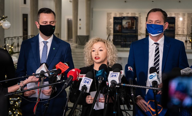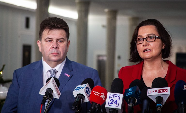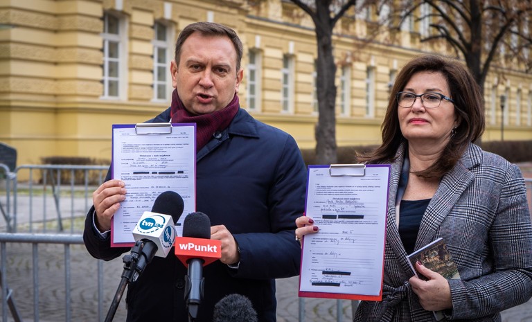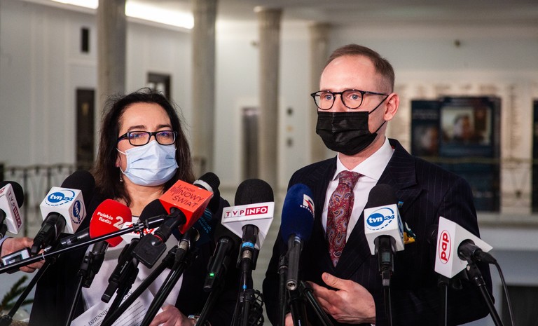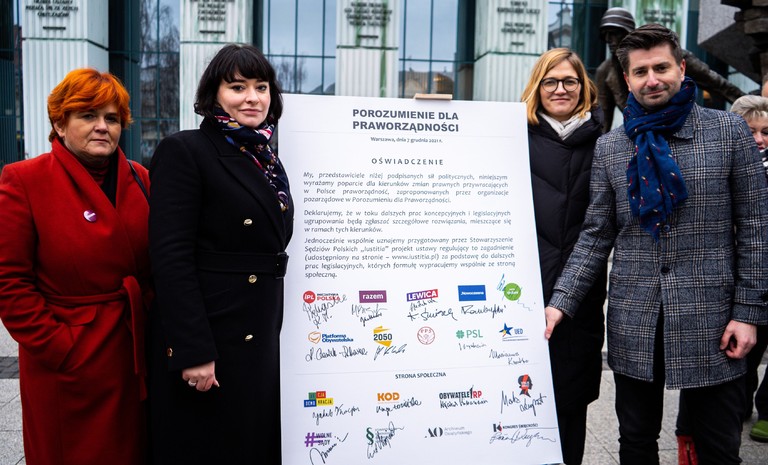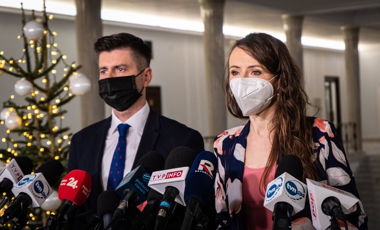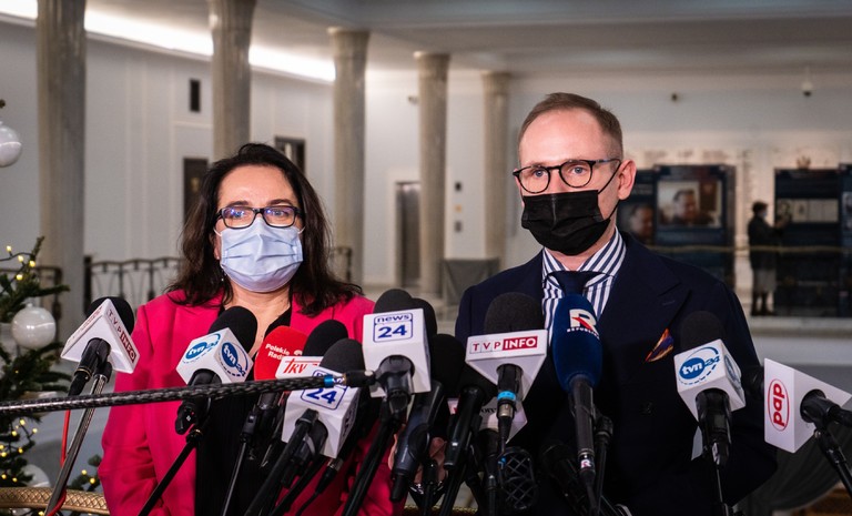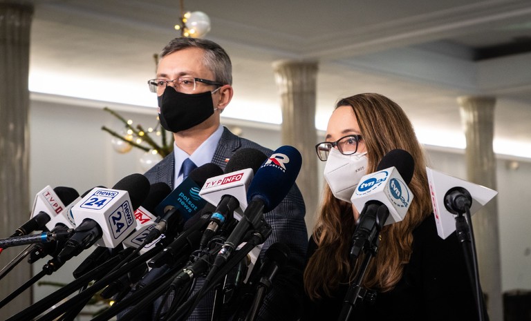 Posłanka Anna-Maria Żukowska oraz poseł Krzysztof Śmiszek w imieniu Nowej Lewicy złożyli podpisy pod deklaracją „Porozumienie dla praworządności” w sprawie wykonania ...